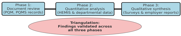 Evidence for the study was drawn from four complementary sources to capture both curriculum reform and student outcomes. Programme and qualification documentation, including Programme and Qualification Mix (PQM) records and Programme Quality Management System (PQMS) documentation, provided information on curriculum design, enrolment patterns, progression, and throughput across diploma, bachelor, advanced diploma, and postgraduate diploma programmes. This material included self-evaluation reports prepared for professional accreditation visits and institutional responses to national quality assurance requirements.