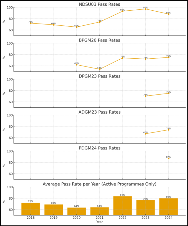 Student success outcomes varied across qualifications and over time, reflecting both programme transition and system-wide disruption during the COVID-19 pandemic. Pass rates in the legacy National Diploma in Surveying were stable at around 70 percent before 2020, declined during the pandemic period, and recovered in the final years before programme closure in 2024. The Bachelor of Geomatics, introduced in 2020, recorded lower pass rates in its early cohorts, reaching the mid-50s in 2021 before stabilising at approximately 74 percent as the programme matured. The Diploma in Geomatics achieved pass rates between 70 and 75 percent in its initial years. In comparison, the Advanced Diploma in Geomatics improved from 67 percent in its first year of delivery to 74 percent in the second. The Postgraduate Diploma in Geomatics recorded an 87 percent pass rate in its inaugural 2024 cohort. These patterns are summarised in Figure 6.
